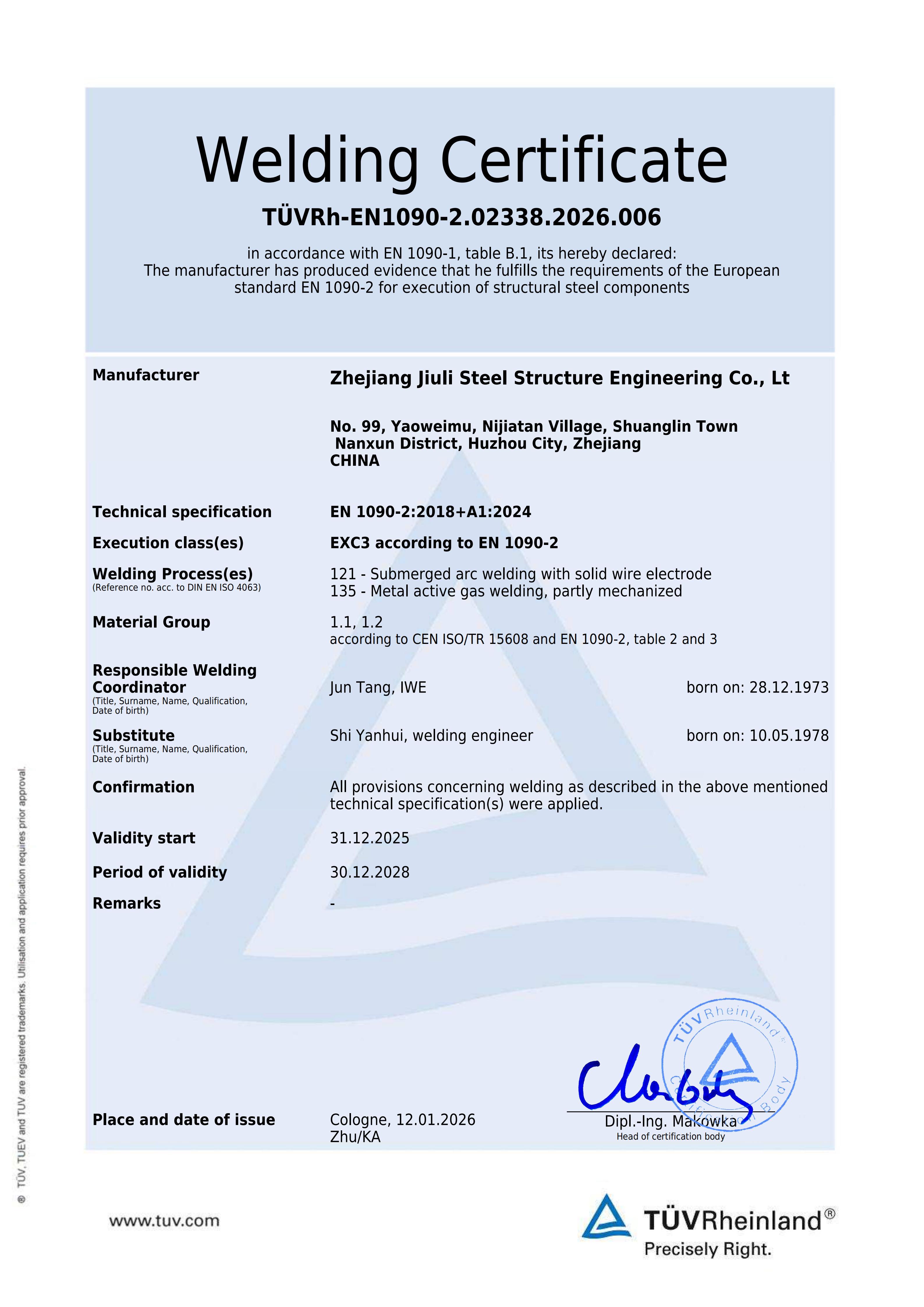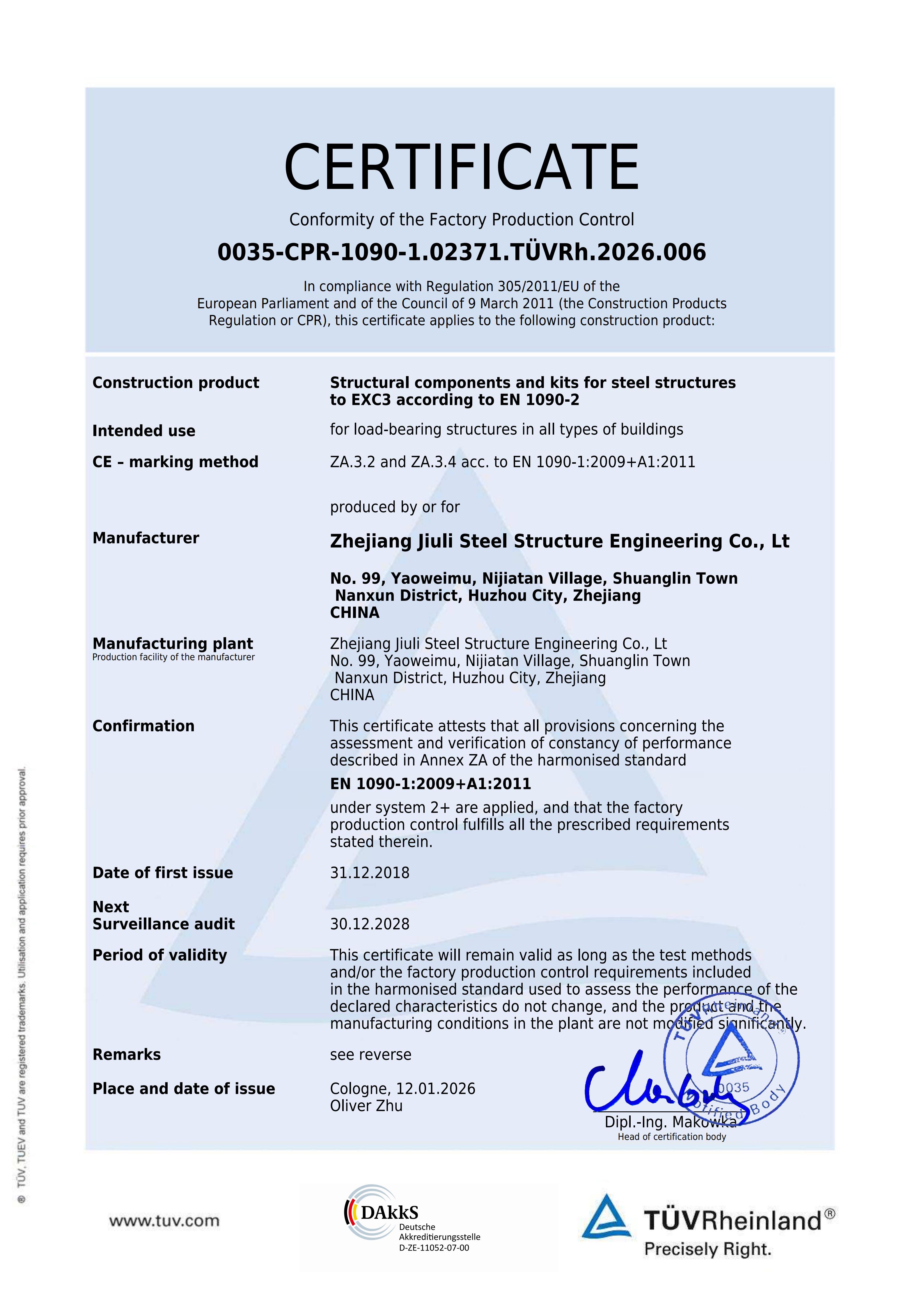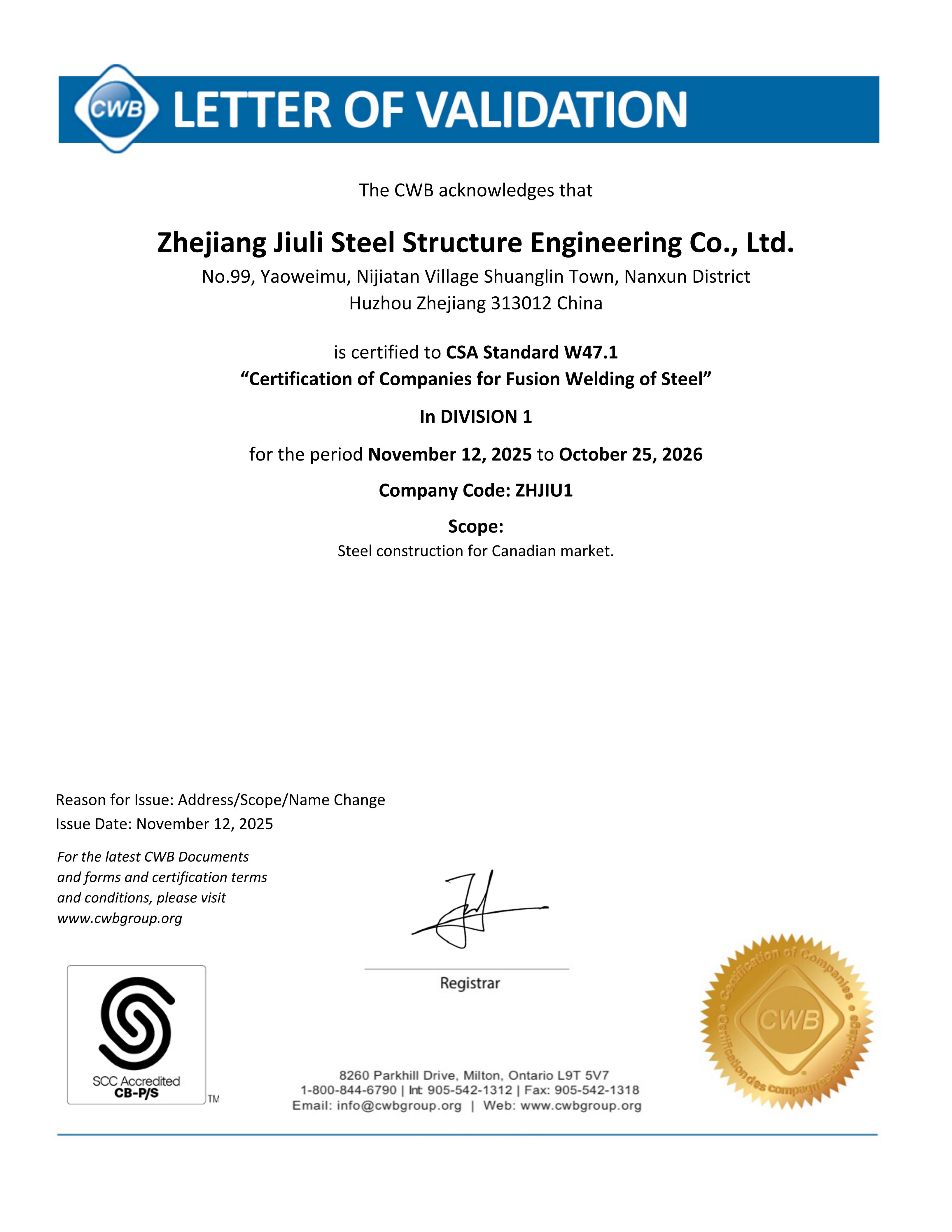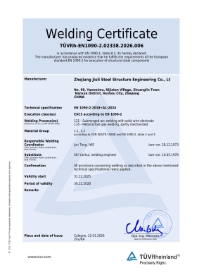 The company has a comprehensive quality assurance system and has passed the certification of ISO9001:2015 quality assurance system. Having the second level general contracting qualification for construction projects, the first level professional contracting qualification for steel structures, and the special manufacturing qualification issued by the Ministry of Construction. We specialize in undertaking the construction of various industrial and civil engineering projects, as well as the design, manufacturing, and installation of steel structures. The company is based in the domestic market and has established multiple marketing offices nationwide, gradually forming a nationwide marketing network and actively participating in international competition. The company has the Canadian CWB certificate, CSA A660-10, American AISC certificate, European EN1090 and ISO3834 certificate certified by the Canadian Welding Association, and can undertake the export processing of steel components with special requirements from Europe, America, Australia, and other countries. It has successfully established branches in Madagascar and Botswana in Africa. Jiuli Steel Structure is one of the first construction enterprises in the Huzhou region to enter the international market.