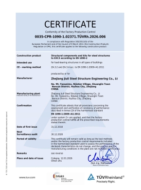 Zhejiang Jiuli Steel Structure Engineering Co., Ltd., founded in February 2001, is based in Huzhou City, the core area of the booming economy of the Yangtze River Delta in China. As a wholly-owned subsidiary of Jiuli Group, our company has not only been awarded honors such as Contract-abiding and Credit-worthy Unit, High-tech Enterprise, and AAA Credit Enterprise in Huzhou City but also holds important memberships in the China Steel Structure Association and the Steel Structure Branch of the Zhejiang Construction Industry Association, demonstrating our authoritative position and outstanding influence in the industry.